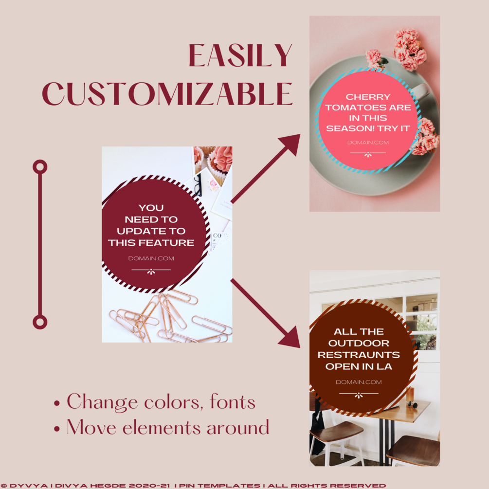 - These done-for-you easily downloadable pin templates are fully customizable from colors to fonts and images.