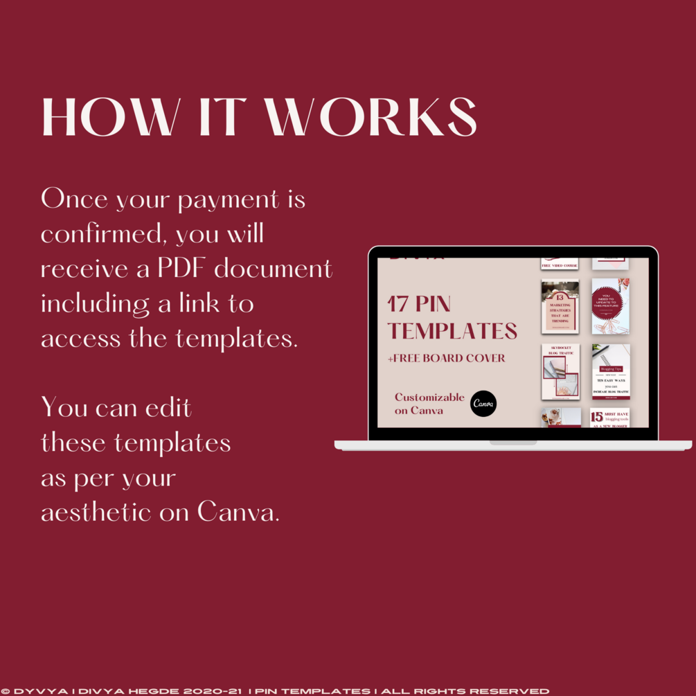 This is a digital product. Hence, you can get instant access to the pin templates by downloading them.